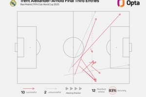 据Opta统计,阿诺德皇马首秀将球传入进攻三区12次,皇马队内最多,其中10次成功,成功率83%。