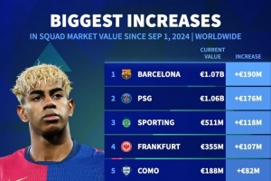体育资讯6月19日讯 德国转会市场列出了本赛季球队身价上涨排名,巴萨上涨1.9亿欧居首,巴黎、葡萄牙体育二三位。