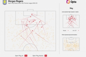 据Opta统计,罗杰斯本赛季联赛助攻10次英超第4多,完成66次过人英超第6多。