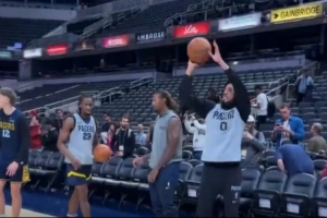 今日步行者队内训练,此前右小腿拉伤的哈利伯顿现身进行投篮,并与队友们有说有笑。