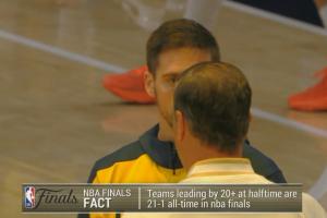 据统计,NBA总决赛历史上半场至少领先20分的球队,战绩为21胜1负。唯一一次被逆转是1948年的费城武士队。