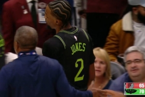 Petraitis:琼斯先与一名裁判交谈,领到第一次技术犯规,随后开始与第二名裁判交流,从而领到第二次技术犯规。