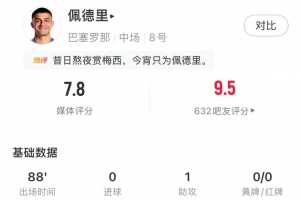 体育资讯12月14日讯 西甲第16轮,巴萨主场2-0击败奥萨苏纳,佩德里代表巴萨首发出战88分钟,球员本场数据如下: