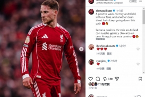 麦卡利斯特社媒晒出比赛照片,配文:“积极的一周,在安菲尔德与我们的球迷一起取得胜利,而且又一次完成零封,让我们继续沿着这条道路前进。”