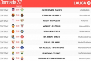 体育资讯5月2日讯 今天,西甲在官方社媒公布了联赛第37轮的比赛时间,10场比赛全部在5月19日凌晨一点钟同时开球。