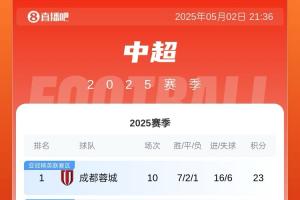体育资讯05月02日讯 中超第10轮战罢,蓉城1-0战胜申花,积分来到23分,以净胜球优势反超申花,队史首次升至榜首,申花则遭遇赛季首败暂列第二。