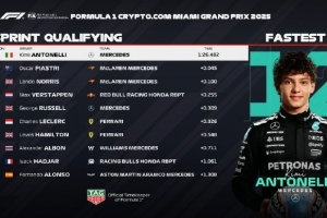 体育资讯5月3日讯 FI迈阿密大奖赛结束冲刺排位赛争夺,梅赛德斯车手安东内利获得冲刺赛排位赛杆位,他将在周六冲刺赛中从第一位发车。