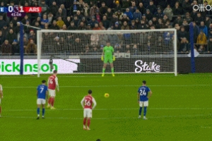 这个点球来源于埃弗顿后卫奥布莱恩禁区内低级的手球失误送点,而约克雷斯罚进点球后,场边埃弗顿主帅莫耶斯也是低头无奈扶额。