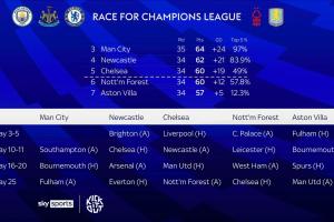 目前排名英超第4的纽卡前五概率达到83.9%。排名第4的切尔西前五概率49%反而低于目前第5的森林(赛程原因)。维拉则是仅有12.3%的概率排前五。