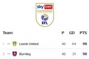 利兹联下半场依靠尼翁托扳平比分,实时积分98分,净胜球优势重回榜首!按照目前的比分,利兹联将夺得英冠冠军。