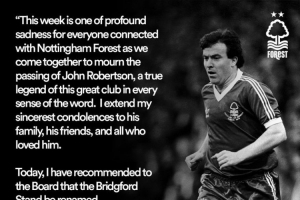 今天,我已向董事会建议将布里奇福德看台更名为“约翰·罗伯逊看台”,以纪念他对俱乐部所做出的非凡贡献。这样,他为俱乐部所创造的财富以及那些英雄事迹会永远被铭记。