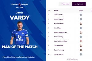 英超官方宣布,瓦尔迪当选莱斯特城vs南安普顿球迷票选全场最佳球员。