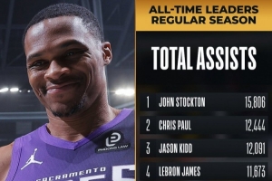 比赛开局3分钟,威少送出2次助攻,职业生涯助攻次数达到10142次,超越魔术师约翰逊独占历史第七!