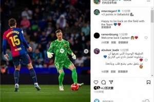 特尔施特根社媒晒出比赛照片,并写道:“在巴拉多利德全取三分。很高兴重返赛场,与球队并肩作战。”