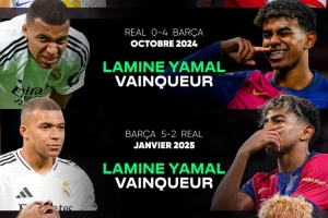 在短短一年不到的时间里,亚马尔已经在国家队和巴萨共4次与姆巴佩直接对决,他取得了全胜: