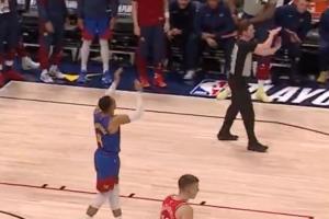 第二次抢断暴扣,挂筐,然后再挂筐,跟裁判同时比出技犯手势!