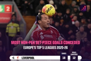 本赛季五大联赛定位球失球榜(非点球):