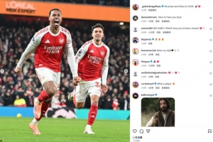 本场比赛加布里埃尔破门先拔头筹,赛后当选英超官方全场最佳。他也在个人社媒晒出本场庆祝照片,配文写道:“所有赞美和荣耀归于上帝!”