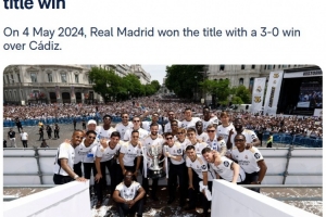皇马官方写道:“一年前的今天,2024年5月4日,皇家马德里在伯纳乌球场3-0击败加的斯,提前锁定队史第36座联赛冠军奖杯。凭借迪亚斯、贝林厄姆与何塞卢的进球,银河战舰在还剩4轮西甲比赛的情况下提前夺冠。”