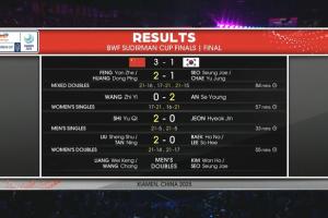 体育资讯05月04日讯 苏迪曼杯混合团体锦标赛决赛,中国vs韩国,最终国羽3-1击败韩国,连续四届夺得苏迪曼杯冠军!这也是国羽队史上第14座苏迪曼杯冠军。