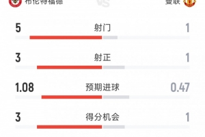 体育资讯5月4日讯 本轮英超曼联对阵布伦特福德的比赛上半场结束,曼联暂时1-2落后,以下为双方半场数据对比: