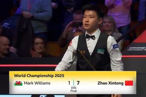 休息回来,赵心童连下四局,并在第七局和第八局打出104分和83分,7-1领先马克-威廉姆斯。