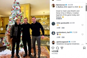 罗马诺配文写道:“2026年伊始与金球奖先生共度。很高兴与莫德里奇、斯尔纳在米兰相遇,两位代表着克罗地亚足球的现在和永恒。”