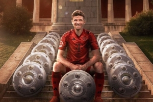 拜仁提前2轮锁定本赛季德甲冠军,这也是穆勒职业生涯获得的第13座德甲奖杯,拜仁官方社媒晒出海报,称赞他的伟大成就。