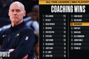 本场比赛过后,步行者主教练卡莱尔的季后赛胜场数为76场,超越查克-戴利和老尼尔森,升至历史第14位。