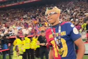 巴萨官方发布视频,球队列队庆祝夺冠。球员们一个个跑过去接受拍头祝贺。