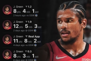 美媒晒出杰伦-格林系列赛每场数据,除了G2打了一场好球砍38分6助攻之外,其他六场最高12分,四场得分个位数。