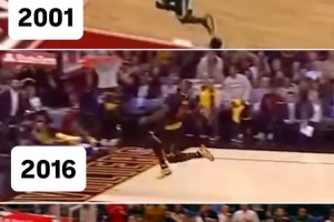 詹姆斯转发了媒体发布的他分别在2001年、2016年及2026年完成招牌式抢断后大风车扣篮的对比画面。