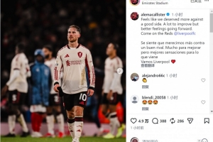 麦卡利斯特社媒晒出比赛照片,并写道:“对阵一支优秀的球队,感觉我们配得上更好的结果。仍有很多需要改进之处,但对未来的感觉更好了,加油红军!”