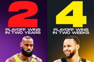 体育资讯5月5日讯 勇士4-3淘汰火箭,晋级次轮。美媒Clutchpoints晒图对比:詹姆斯两年赢了两场季后赛,库里两周赢四场。