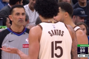 GIF-桑托斯与威少篮板卡位时被吹犯规,勇士挑战成功;但桑托斯打到威少脸部,被补吹T