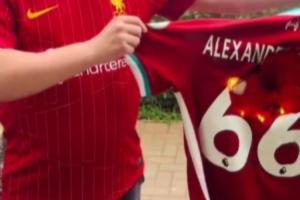 有利物浦球迷发布视频,焚烧阿诺德的66号球衣。