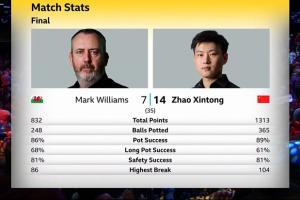 第三阶段上半场战罢,目前赵心童以14-7的比分领先威廉姆斯。