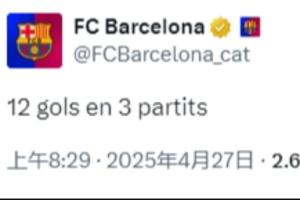 赛后,巴萨官推发文:“3场比赛12球。”