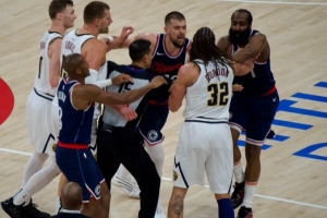 体育资讯4月27日讯 快船掘金G4,上半场快船最后一攻双方爆发冲突,哈登不满布劳恩犯规和对方发生口角,约基奇戈登鲍威尔等人上来后冲突扩大。
