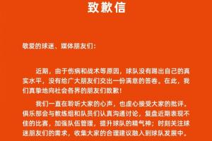 近期,由于伤病和战术等原因,球队没有踢出自己的真实水平,没有给广大朋友们交出一份满意的答卷。在此,我们真挚地向社会各界的朋友们致歉!