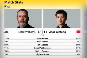 体育资讯05月06日讯 斯诺克世锦赛决赛,赵心童vs马克-威廉姆斯第四阶段,上半场结束,赵心童17-12领先马克-威廉姆斯。