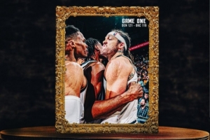赛后,掘金官方发布了本场赢球海报,威少和戈登荣登封面。