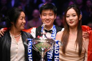 体育资讯05月07日讯 赵心童击败马克-威廉姆斯,捧起斯诺克世锦赛冠军。夺冠现场,与他一同登台的还有他的女友(右),以及谢菲尔德斯诺克学院院长Victoria Shi(左)。