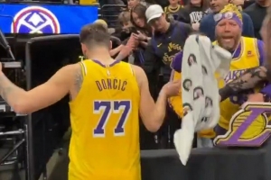 GIF-东契奇和詹姆斯赛后送毛巾 球迷都欣喜若狂