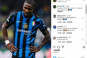 国米前锋图拉姆社媒晒出自己的比赛照片,并写道:“我们是8万人对阵11人,这结果早已注定🖤💙”