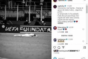 此役攻入一球的巴萨边锋拉菲尼亚社媒发文:“我们会更强大地归来……感谢所有巴萨球迷的支持……我们继续并肩作战……赛季尚未结束。