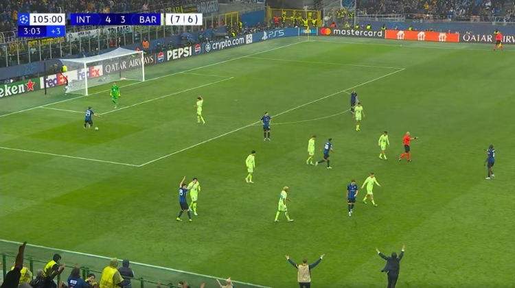 欧冠半决赛次回合,国米4-3淘汰巴萨。加时上半场最后时刻,国米最后一攻,主裁马齐尼亚克到点响哨引发国米多人不满,小因扎吉和多名替补球员进场抗议,迪马尔科眼疾手快拦住主帅。