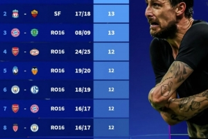 体育资讯5月7日讯 在本赛季欧冠半决赛,国米与巴萨贡献2场进球大战,最终国米总比分7-6晋级。德转也盘点了欧冠改制以来单轮淘汰赛进球榜,其中国米与巴萨对决并列第一,具体如下: