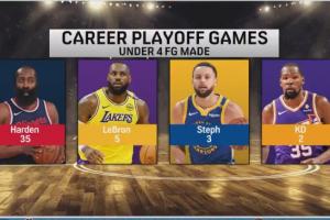 根据统计,这是哈登季后赛生涯第35场运动战进球少于4个(即小于等于3),作为对比,詹姆斯有5场、库里有3场、杜兰特有2场。