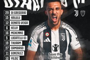 尤文首发:29-迪格雷戈里奥、15-卡卢卢、12-维加、6-凯利、16-麦肯尼、5-洛卡特利、19-K-图拉姆、27-坎比亚索、11-冈萨雷斯、10-伊尔迪兹、20-穆阿尼